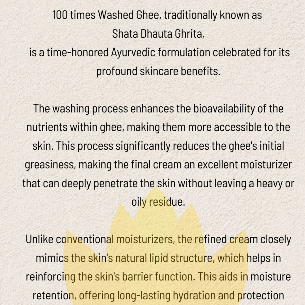 Made with pure A2 cow ghee, this cream is a blessing passed on by our ancestors. 100 times Washed Ghee, traditionally known as Shata Dhauta Ghrita, is a time-honored Ayurvedic formulation celebrated for its profound skincare benefits.